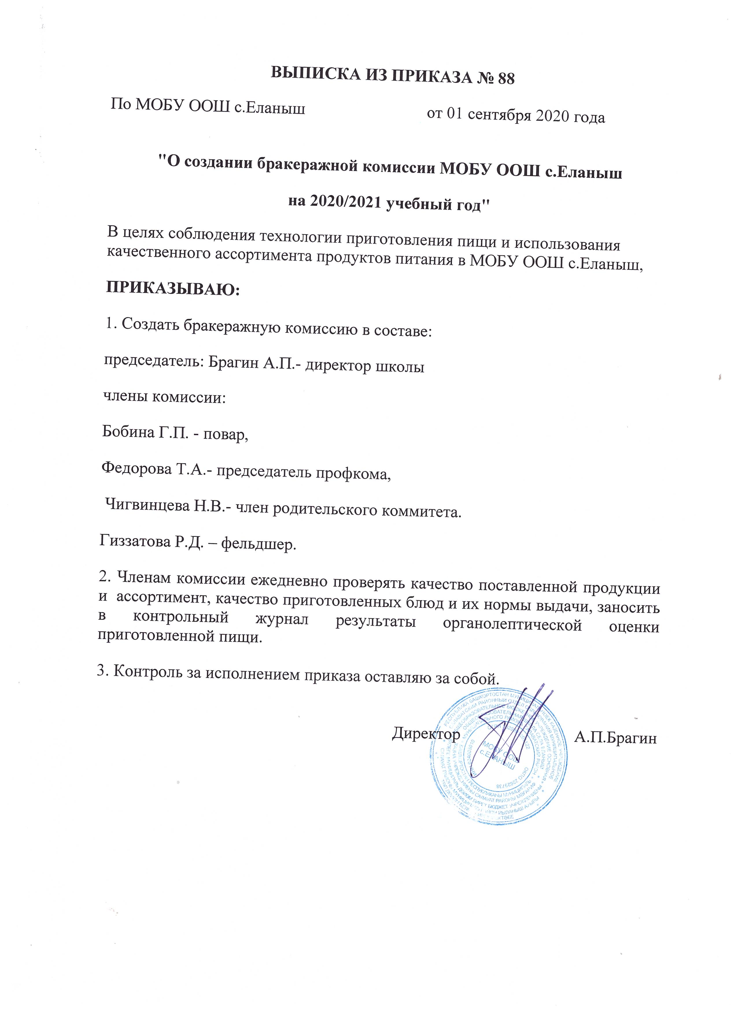 Контроль качества питания по органолептическим показателям (бракераж пищи) до приема ее детьми ежедневно осуществляется бракеражной комиссией, утвержденной приказом директора школы.