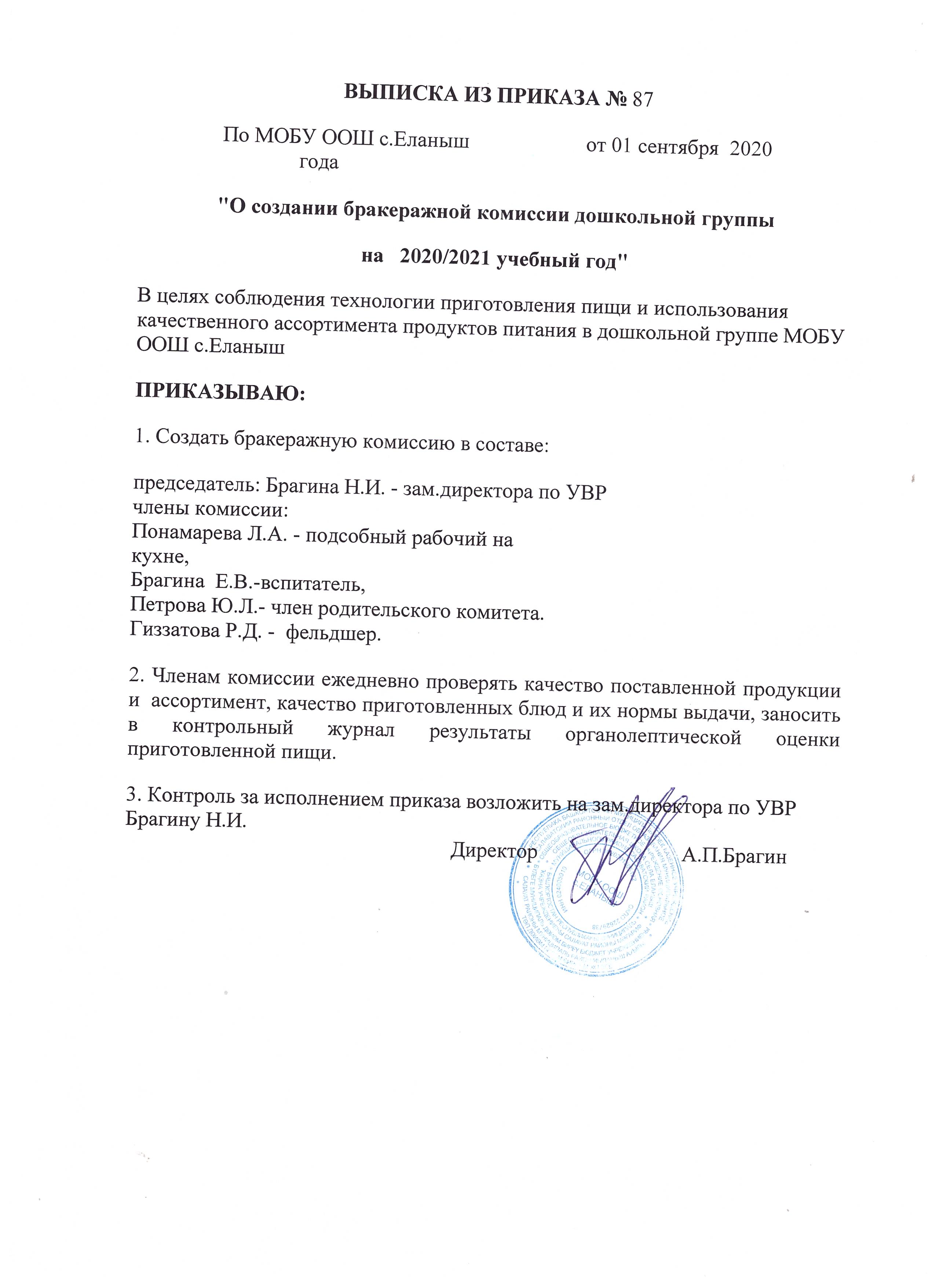 - Ответственный за организацию питания: Брагина Наталья Игоревна