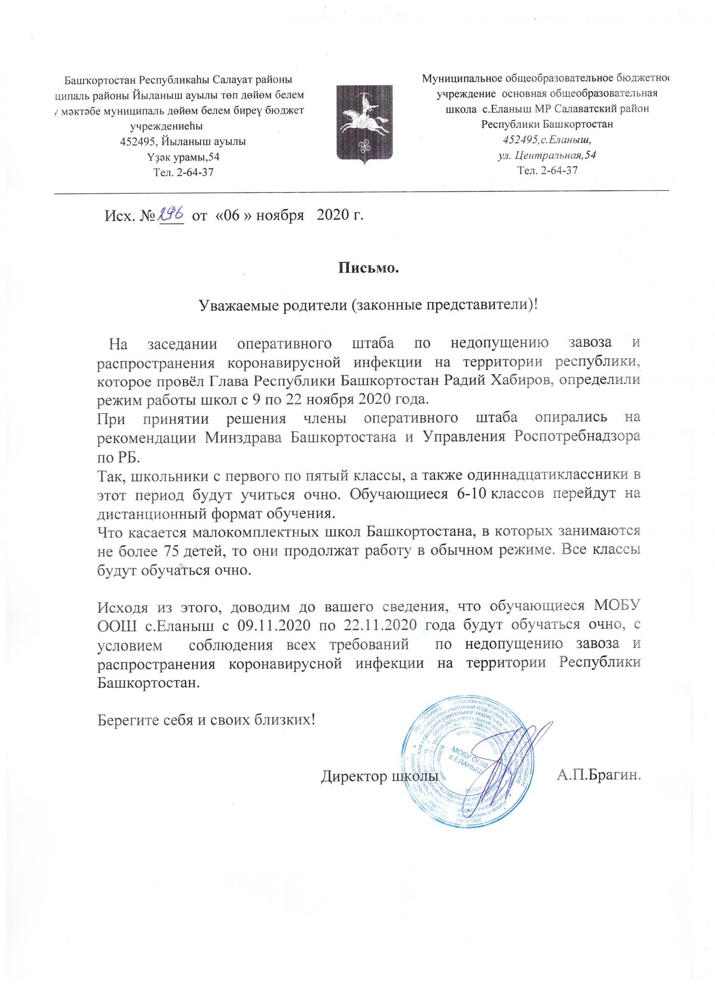 Письмо для родителей о форме обучения с 09.11.20